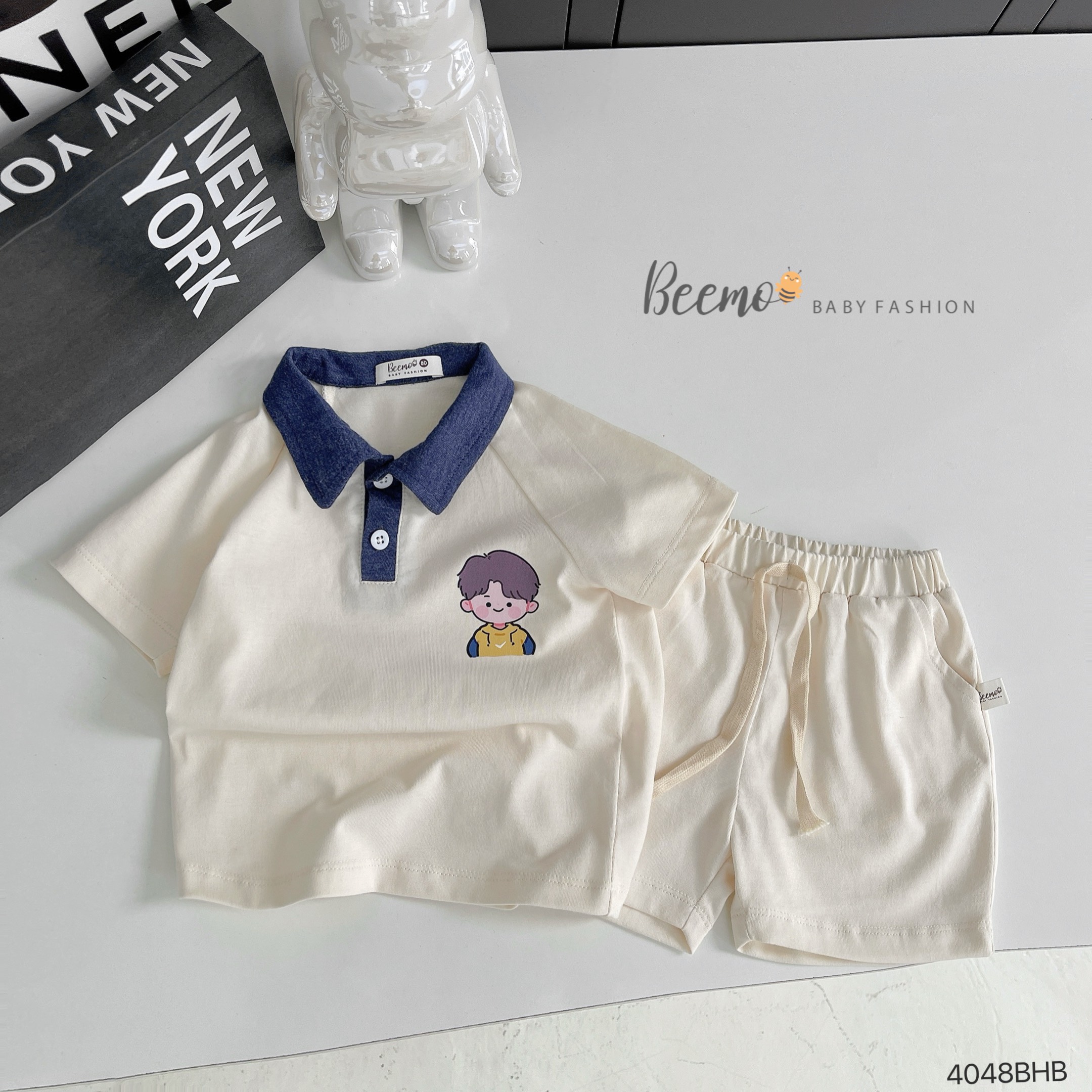 🍍Thiết kế áo phông cộc tay cổ polo hình in bé trai dễ thương, quần short lưng thun kèm dây rút